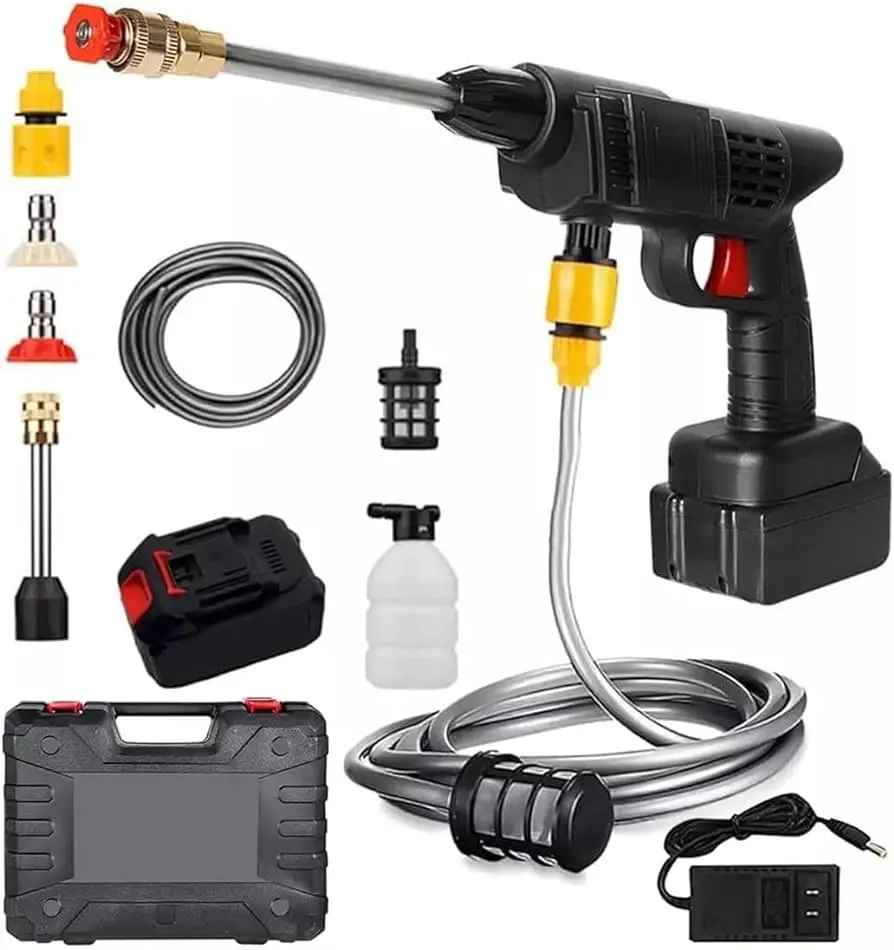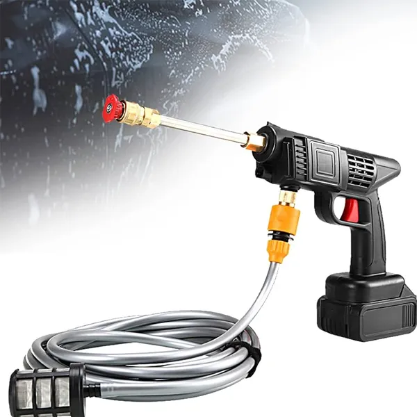Fácil de usar: en comparación con las lavadoras eléctricas tradicionales, esta lavadora portátil para automóvil es más fácil de instalar. En primer lugar, instale el conector rápido en la pistola rociadora, luego instale la manguera de PVC en el extremo del conector y otro lado de la manguera para instalar el filtro (filtrará las impurezas para proteger la pistola rociadora), en segundo lugar, para instalar la boquilla en el rociador, y finalmente inserte la batería para encender esta pistola de presión inalámbrica.